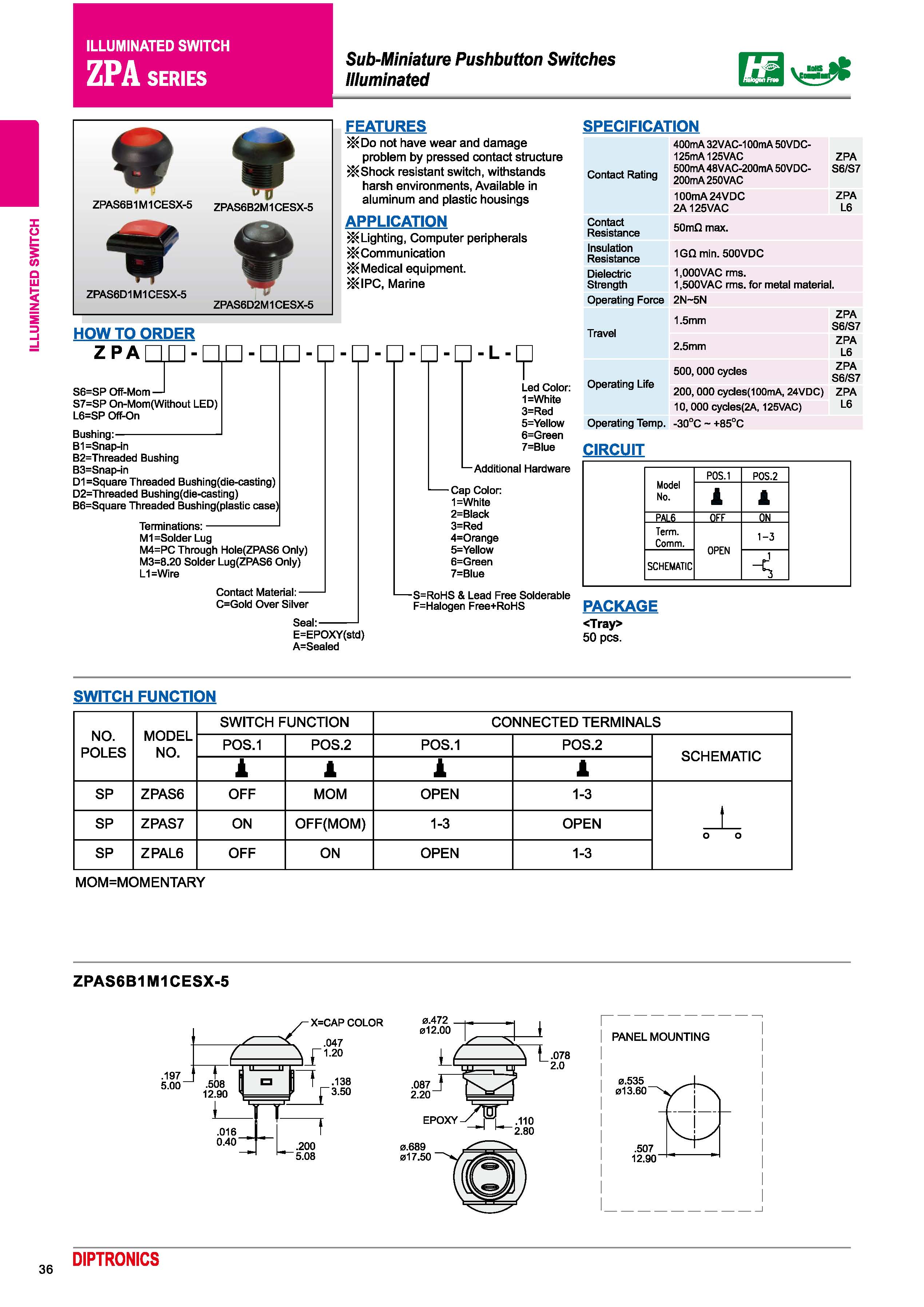 台湾圆达DIP ZPA系列带灯开关